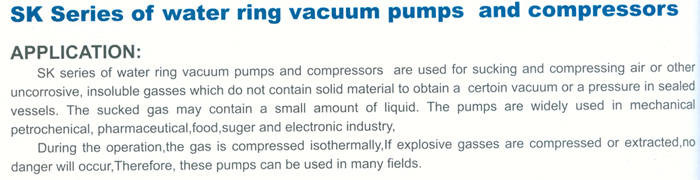 | SK系列水環(huán)真空泵及壓縮機(jī) 用途及特點(diǎn): SK系列水環(huán)真空泵及壓縮機(jī)是用來抽吸或壓縮空氣和其他五腐蝕性、不溶于水,不含固體顆粒的氣體,以便在密閉容器中形成真空和壓力,吸入氣體允許混有少量液體。 該系列水環(huán)真空泵及壓縮機(jī)被廣泛應(yīng)用于機(jī)械、石油化工、制藥、食品、制糖工業(yè)及電子領(lǐng)域。由于在工作過程中,氣體的壓縮過程是等溫的,所以在壓縮或抽吸爆炸氣體時,不易發(fā)生危險,因而其應(yīng)用更加廣泛。