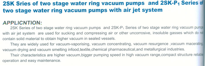| 2S系列雙級(jí)水環(huán)真空泵及2SK-P1系列雙級(jí)水環(huán)大氣噴射泵機(jī)組 用途及特點(diǎn): 2S系列雙級(jí)水環(huán)真空泵及2SK-P1系列雙級(jí)水環(huán)大氣噴射泵機(jī)組被用來(lái)抽吸空氣和其他無(wú)腐蝕性、不溶于水,不含固體顆粒的氣體,以便在密閉容器中獲得較高真空。 它被廣泛用于、紡織、化工醫(yī)藥和冶金工業(yè)及電子領(lǐng)域的真空蒸發(fā)、真空濃縮、真空回潮、真空浸漬、真空干燥及真空冶煉等。該產(chǎn)品具有真空度高、在高真區(qū)抽速大及結(jié)構(gòu)緊湊、工作可靠、維修方便等特點(diǎn)。