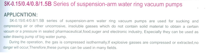 SK-0.15/0.4/0.8/1.5B懸臂水環(huán)式真空泵,是用來抽吸空氣和其它無腐蝕性、不溶于水,不含固體顆粒的氣體,以便在密閉容器中形成真空,但吸入氣體允許混有不良液體。它被廣泛應(yīng)用于機械、石油化工、制藥、食品、制糖工業(yè)及電子領(lǐng)域,還特別適合做大型水泵引水用。