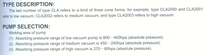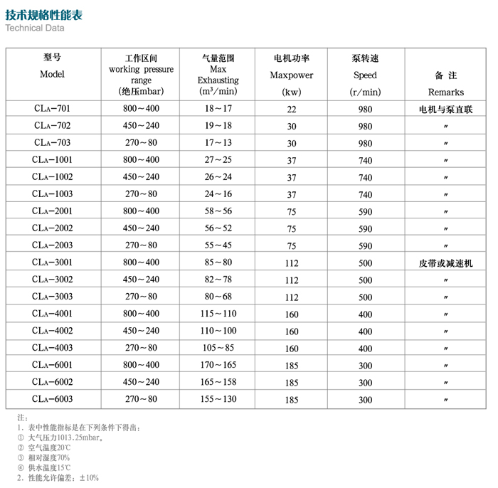 | CLa型水環(huán)真空泵 用途: CLa型徑向吸排單作用水環(huán)真空泵是吸收國(guó)際最先進(jìn)的水環(huán)真空泵技術(shù)而研制的新產(chǎn)品,該系列產(chǎn)品具有高效節(jié)能的特點(diǎn)。廣泛應(yīng)用于化工、煤礦、冶金、制藥、造紙、輕工、礦山、發(fā)電廠、食品等行業(yè),特別適用于惡劣的工作環(huán)境,如造紙工業(yè)中的脫水處理和采礦業(yè)中的真空過(guò)濾等。 特點(diǎn): 1.徑向吸排氣,采用錐體分配器結(jié)構(gòu),與軸向吸排氣平面泵相比,吸排氣通道截面積大,流阻小,抽干空氣時(shí)節(jié)能18%左右,抽飽和水蒸氣時(shí)節(jié)能28%左右。 2.葉輪兩端封閉、剛性好》 型號(hào)說(shuō)明: CLa型號(hào)最后一個(gè)數(shù)字代表三種錐體形式的一種,如CLa2000型 CLa2001型代表低真空,CLa2002型代表中真空,CLa2003型號(hào)代表高真空》 選泵: 泵的工作區(qū)間 (1)低真空泵吸入壓力范圍為800-400hpa(mbar)(絕圧) (2)中真空泵吸入壓力范圍為450—240hpa(mbar)(絕圧) (3)高真空泵吸入壓力范圍為270—80hpa(mbar)(絕圧) 注意:如果吸入壓力在兩種真空泵中間,可選用其中任何一種,如要求吸入壓力為280mbar時(shí)可選用中真空泵,也可選用高真空泵。