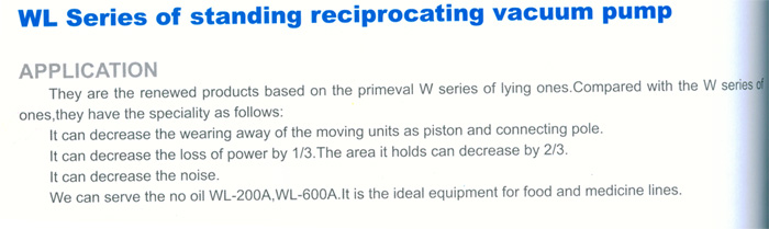 | WL系列立式往復(fù)真空泵 用途及特點(diǎn): 目前我公司生產(chǎn)的新型WL系列立式往復(fù)真空泵,是原W型臥式真空泵的更新?lián)Q代產(chǎn)品。與W型臥式真空泵相比,該泵具有以下優(yōu)點(diǎn): 1.氣缸、活塞環(huán)、十字頭等平均磨損率低,氣閥壽命高。 2.功率損耗低1/3,占地面積減少2/3. 3.因消除了橫波劣行振動,故降低了噪聲。 4.WL_200A、WL-600A可按無油形式供貨,大大提高了真空清潔度,是食品、制藥等行業(yè)的理想設(shè)備。