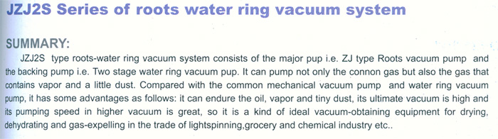 | JZ2S系列羅茨水環(huán)真空機(jī)組 概述: JZ2S系列羅茨————水環(huán)真空機(jī)組是由ZJ型羅茨真空泵作為主軸泵,雙極水環(huán)真空泵作為前級泵組成的抽氣機(jī)組。它不僅可以用來抽除一般氣體,還可以抽吸含有水分及少量灰塵的氣體。它與一般機(jī)械真空泵和一般水環(huán)式真空泵相比,具有不怕油污染,不怕水蒸氣及微塵,極限真空度高以及在較高真空度工況下抽素大的優(yōu)點(diǎn),是輕紡、食品、化工等行業(yè)領(lǐng)域的干燥、脫水及真空除氣的一種理想的真空抽氣設(shè)備。